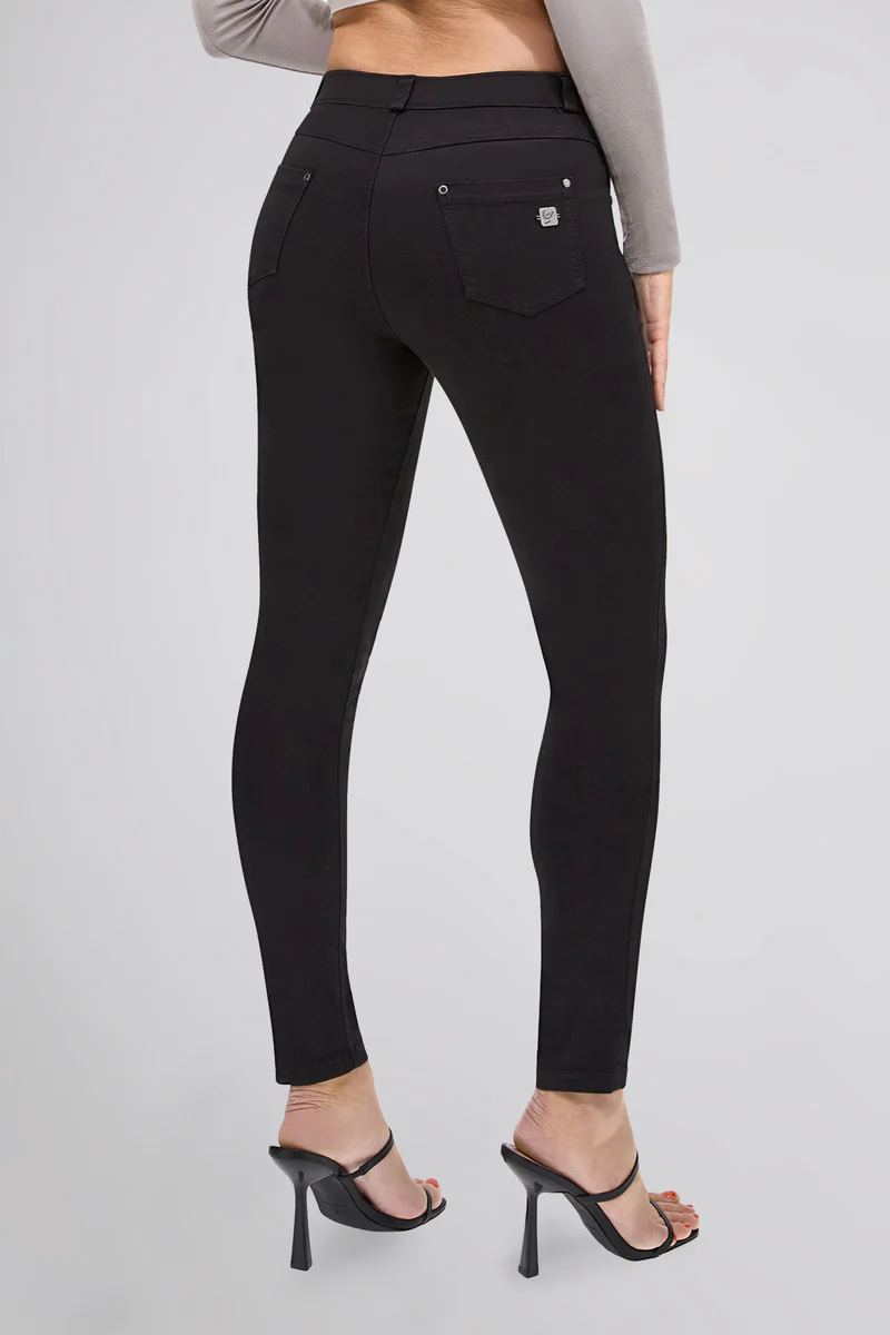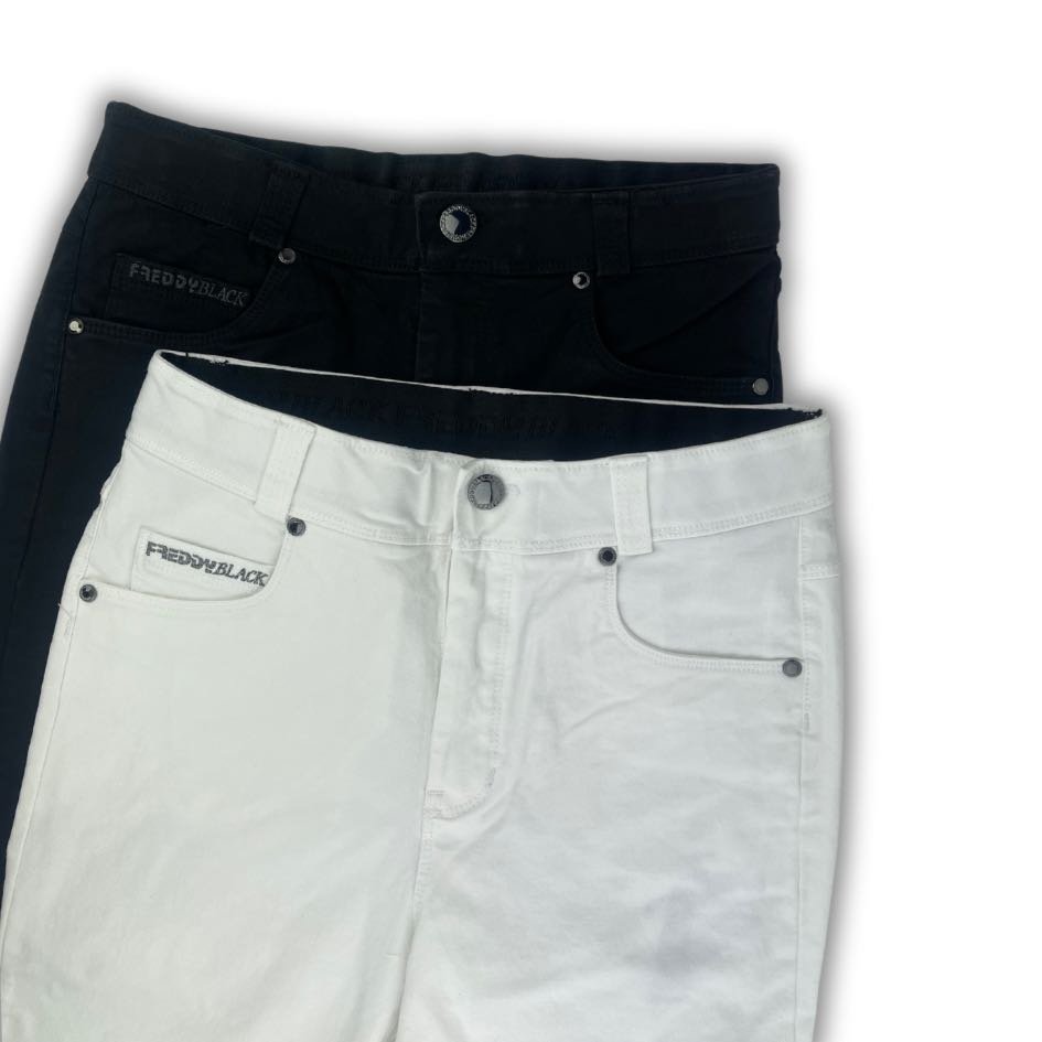 Freddy Black jeans, the five-pocket jeans that ensure absolute comfort thanks to the use of stretch and shuttle-woven denim, here in different tones. Details such as rivets, buttons, an inner elastic band, Freddy logo and black zips define the line. This regular-waist, regular-length style features belt loops, a covered elastic waistband fastened by a metal button and zip, and a slim fit to gently embrace your curves. This comfortable garment stands out for its dynamic, youthful spirit, brought out by the delicate hue
